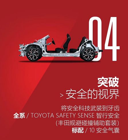 除了TOYOTA SAFETY SENSE智行安全,全系還標配10安全氣囊。是的,你沒有聽錯,是10安全氣囊,包括主副駕氣囊、前后排側氣囊、簾式安全氣囊、駕駛席膝部氣囊,副駕駛座墊氣囊,在事故發(fā)生時能給予車內(nèi)人員全面的保護。