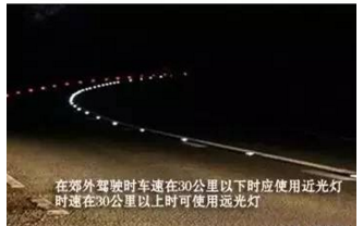 郊外駕駛,車速在30公里以下時(shí)應(yīng)使用近光燈。時(shí)速在30公里以上時(shí),可使用遠(yuǎn)光燈。